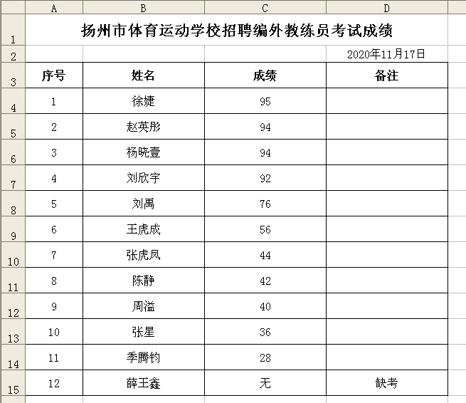 招聘编外教练员考试成绩